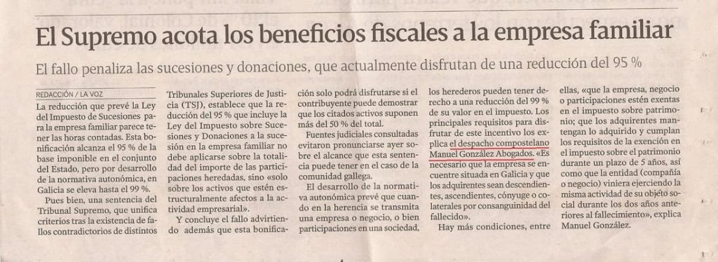 • La Voz de Galicia (10/09/2015), El Supremo acota los beneficios fiscales de la empresa familiar.